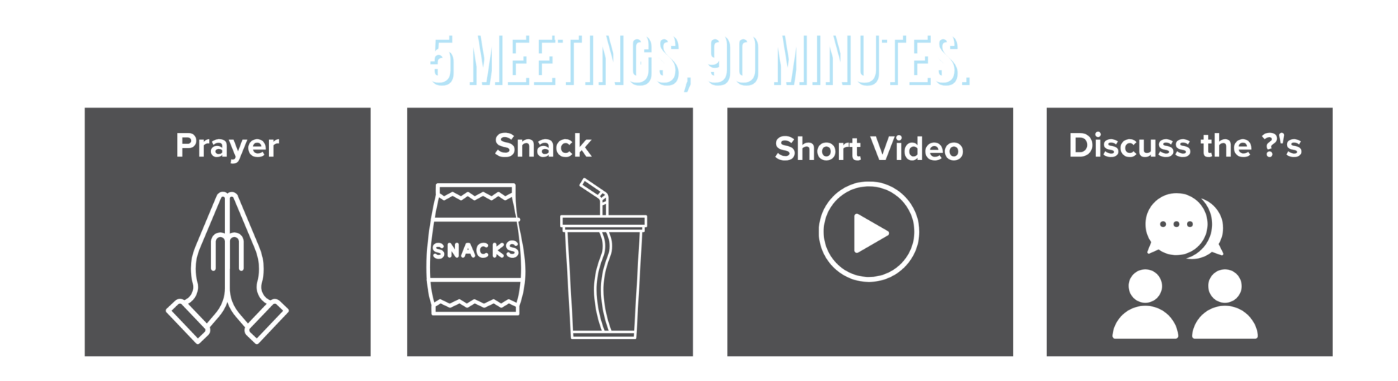 You'll share a simple snack, watch a short video, and use some discussion questions as a guide for conversation. You'll also pray together at the beginning and end of the meeting.